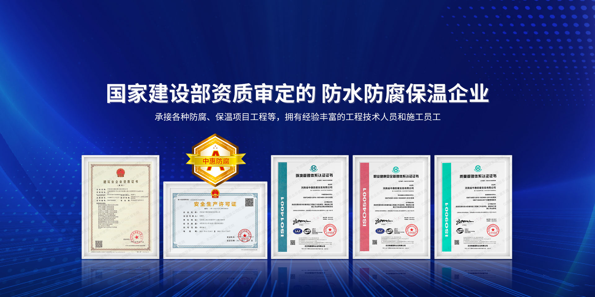 公司經營范圍:防水防腐保溫工程;消防設施工程;建筑裝修裝飾工程;建筑機電安裝工程;電力工程;建筑工程;石油化工工程;工業清洗工程;油罐清洗工程;鋼結構工程;環保工程;模板腳手架工程;電纜防火封堵、防污閃噴涂、外墻外保溫工程;各類施工勞務作業;設備維修、船舶鉚焊、涂裝;電力工程材料、建材、防水材料、防火材料、防腐保溫材料銷售,并相繼通過了GB/T19001-2008idtISO9001:2008GB/T50430-2007質量管理體系認證證書。GB/T24001-2004idtISO14001:2004環境管理體系認證證書。GB/T28001-2011idtOHSAS18001:2007職業健康安全管理體系認證證書。公司是中國防腐蝕于防護協會、中國施工企業管理協會、電力協會和中國鋼結構防水協會會員單位。 公司的經營業務涵蓋了石油、化工、電力、冶金、煤炭、船舶、國防、燃氣、水利、環保、交通運輸、航空及國防軍工和輕紡市政等行業的防腐保溫絕熱設備。鋼結構安裝、防火、防水、金屬噴鍍、聚脲噴繪、陰極保護、防滲透堵漏、玻璃鋼及各種磚版材料襯里、橡膠襯里、煙氣硫和耐酸溶劑腐蝕等工程施工。公司連續十年榮獲“省市先進施工企業”“安全生產先進單位”“重合同,守信用企業”和“AA***資質企業”的稱號。2000年被命名為市級文明單位,2002年被國家工商行政管理局命名為“重合同,守信用的企業”、被中國工業防腐蝕技術協會命名為“防腐蝕企業,能源節約及環境保護領域有豐富的經驗和***的業績。工程一次交驗合格率100%。其中攀枝花鋼鐵公司煉鐵廠四號高爐及熱風爐防腐工程、上海寶鋼公司煤氣柜防腐工程、撫順石油一廠裝置防腐項目、齊魯石化公司稀烴廠高塔防腐工程、吉林化學工業公司煉油廠油罐防腐工程、天津石化熱電廠六號爐頂棚聯絡管保溫工程、大慶油田(太倉)力神泵業工程、中國化學工程第十一建設工程、中原油田勘探局工程、中國石化銷售有限公司華北分部、魯皖輸油管道工程、貴州開磷息烽合成氨工程、陜西黃陵煤化工程、中國石油天然氣西部管道塔里木輸油工程、邯鋼集團邯寶鋼鐵公司煉鐵工程、德州供電工程、吉寶(南通)船廠工程,偃師華潤熱力工程、鄭州熱力總公司。 河南省中惠防腐安裝有限公司愿以豐富的施工經驗,***的技術,***的設備,***的管理,***的服務,竭誠為國內外廣大的用戶提供***滿意、******的工程作品。 我公司愿與國內外同仁一道,團結協作,共同推進防腐蝕行業發展! 公司地址:河南省長垣縣建設路北段360號 固定電話:0373-8866488 郵編:453400 網址:http://www_zhff_com_cn.duanshipinjianji.com